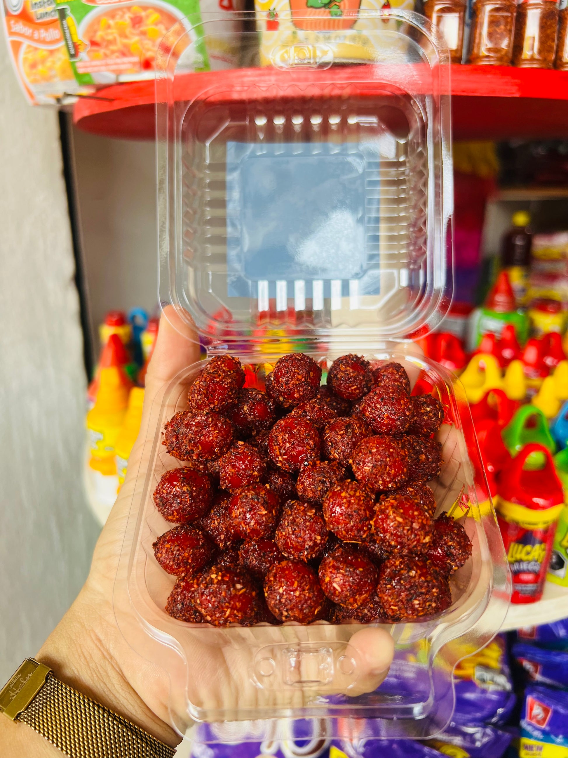 Gomitas de cereza cubiertas con Chamoy y Tajín