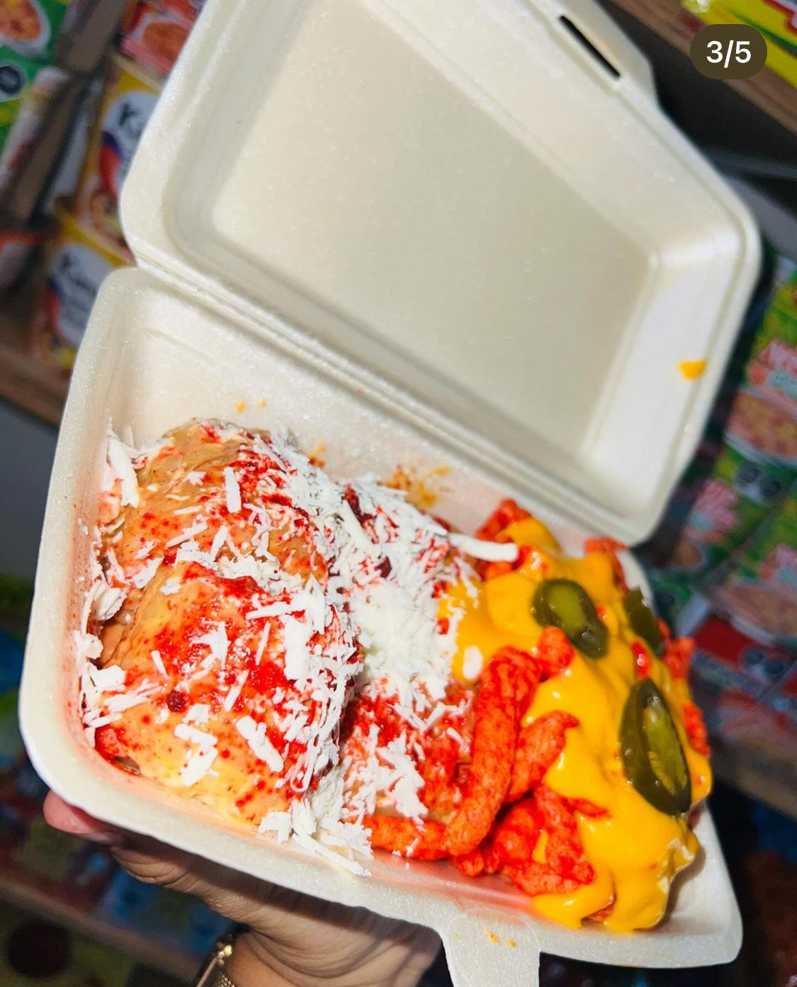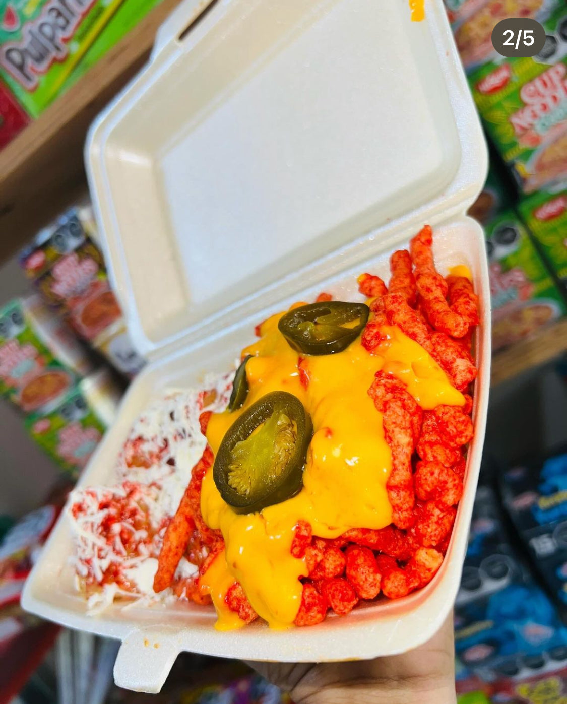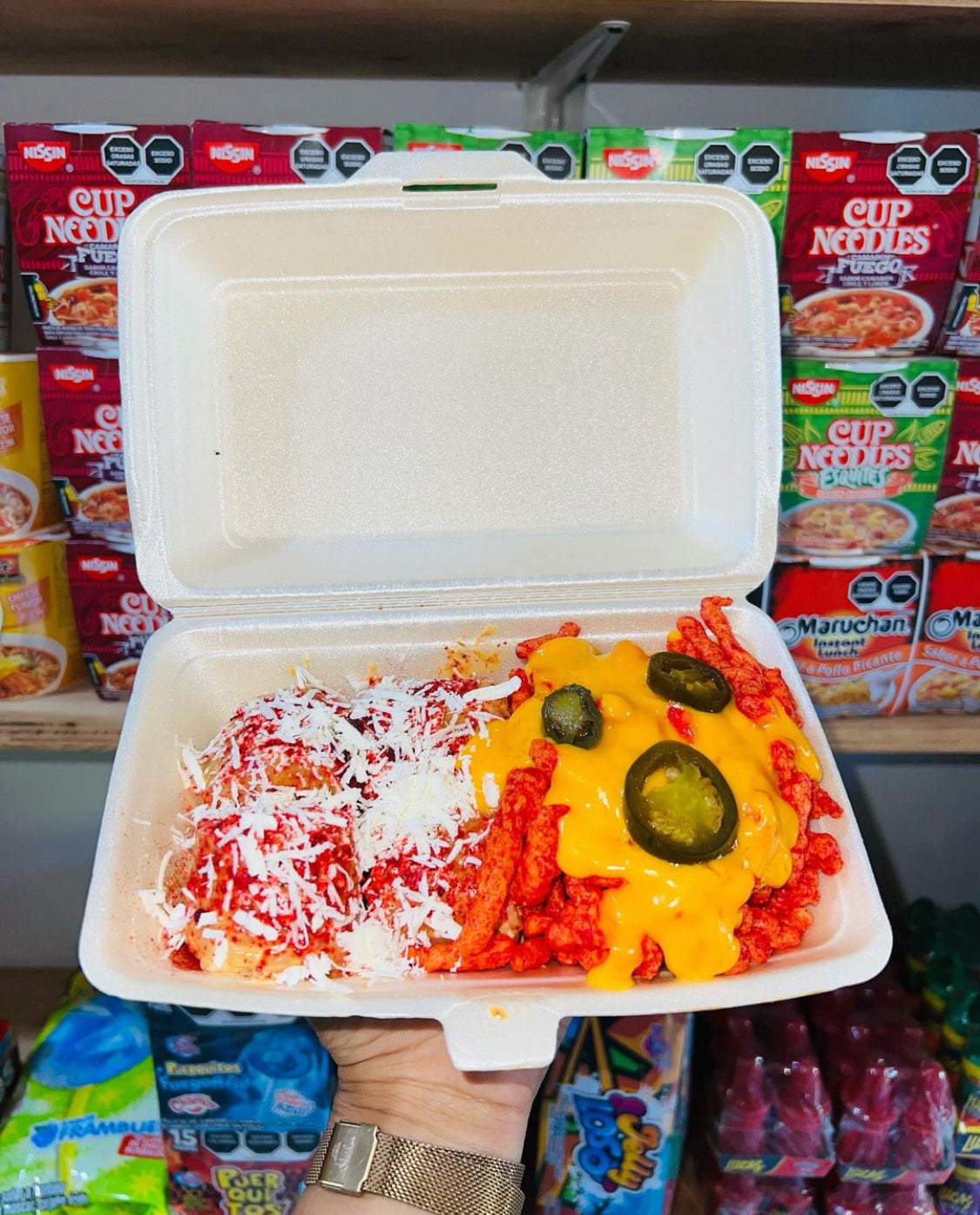 Bandeja con delicioso elote troceado más cheetos flamin’hot bañados con queso cheddar con jalapeño