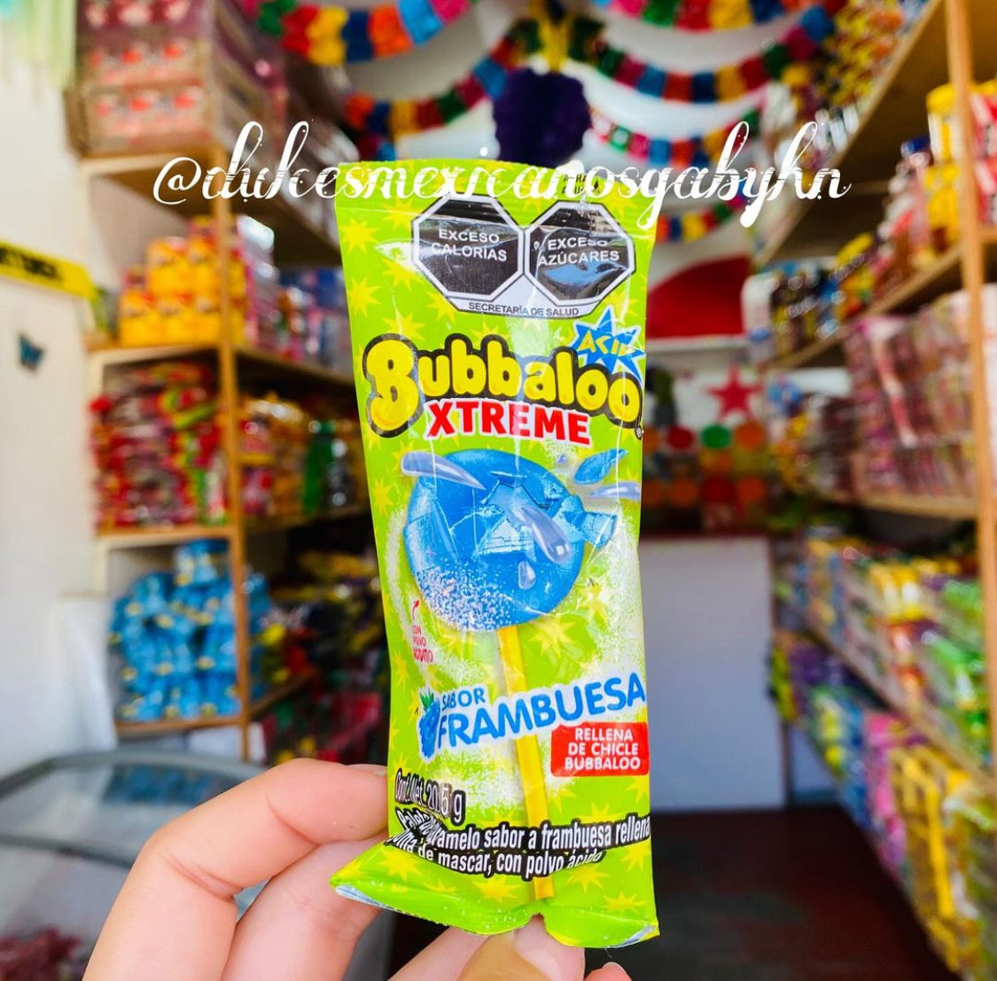 Paleta de caramelo sabor frambuesa rellena con goma de mascar con polvo ácido